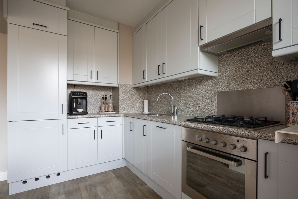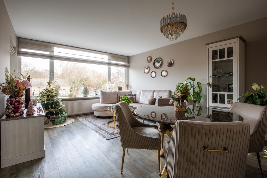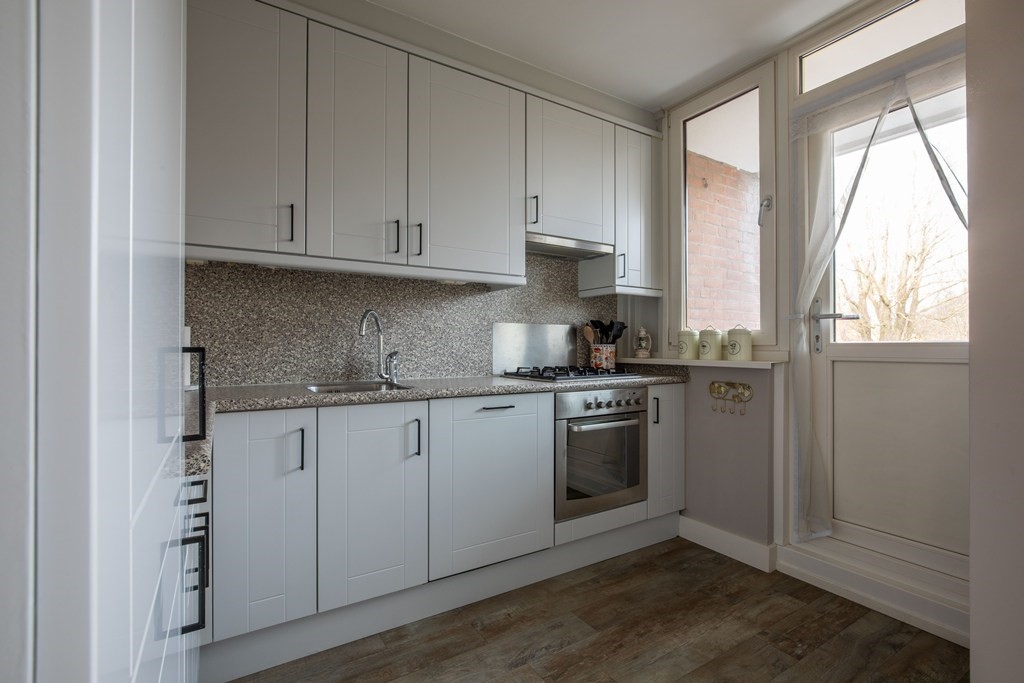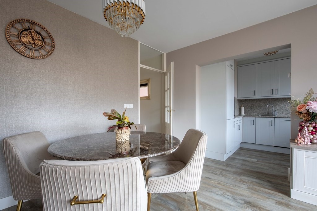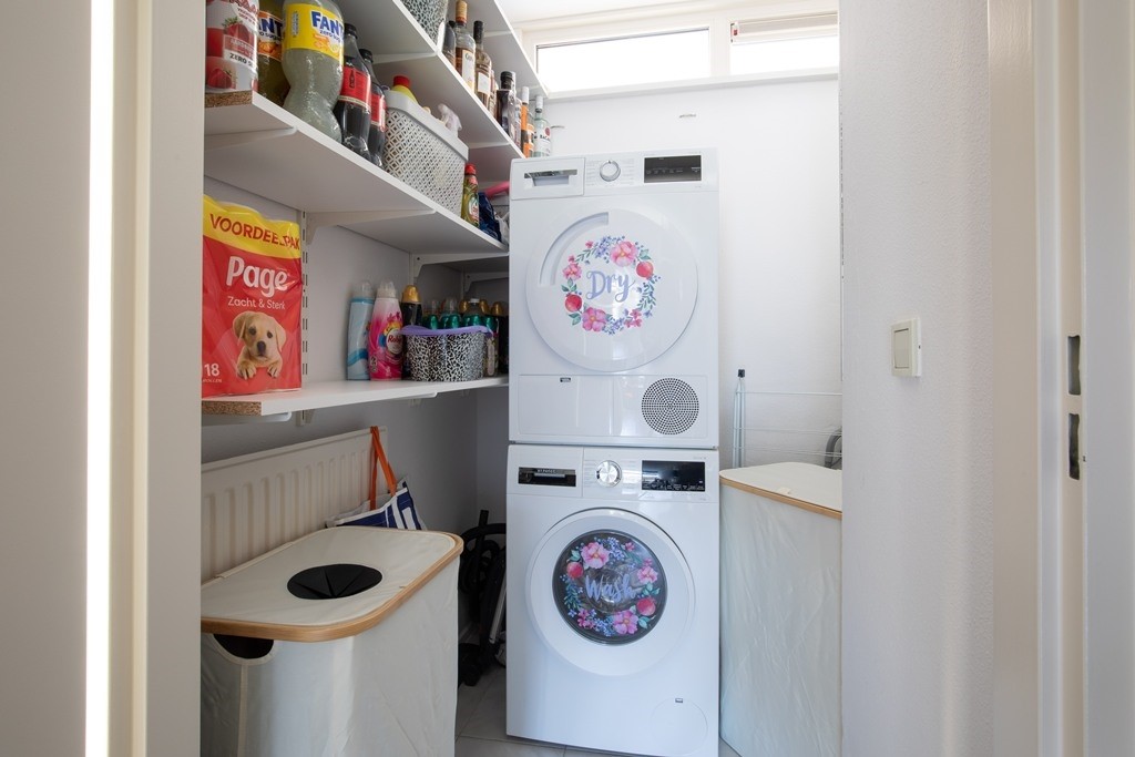 De woonkamer is dankzij de grote raampartijen heerlijk licht en voelt direct uitnodigend aan. De halfopen L-vormige keuken is volledig uitgerust met inbouwapparatuur zoals koelkast, vriezer, vaatwasmachine, gaskookplaat en oven. Vanuit de keuken bereik jij het tweede balkon, gelegen aan de achterzijde.