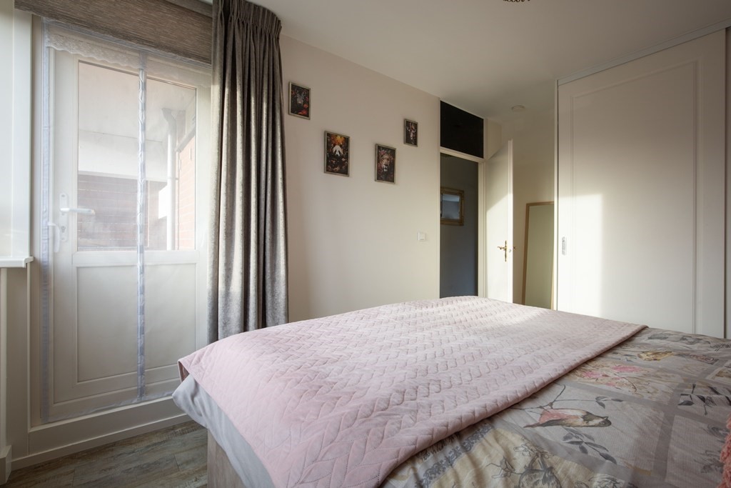 Entree in de hal met meterkast en een praktische separate inpandige berging voor wasmachine, droger en cv-ketel. Vanuit de hal bereik jij de royale slaapkamer aan de voorzijde, die tevens toegang biedt tot het zonnige balkon op het zuiden. Aansluitend vind jij de modern uitgevoerde badkamer met toilet, wastafelmeubel en douche.