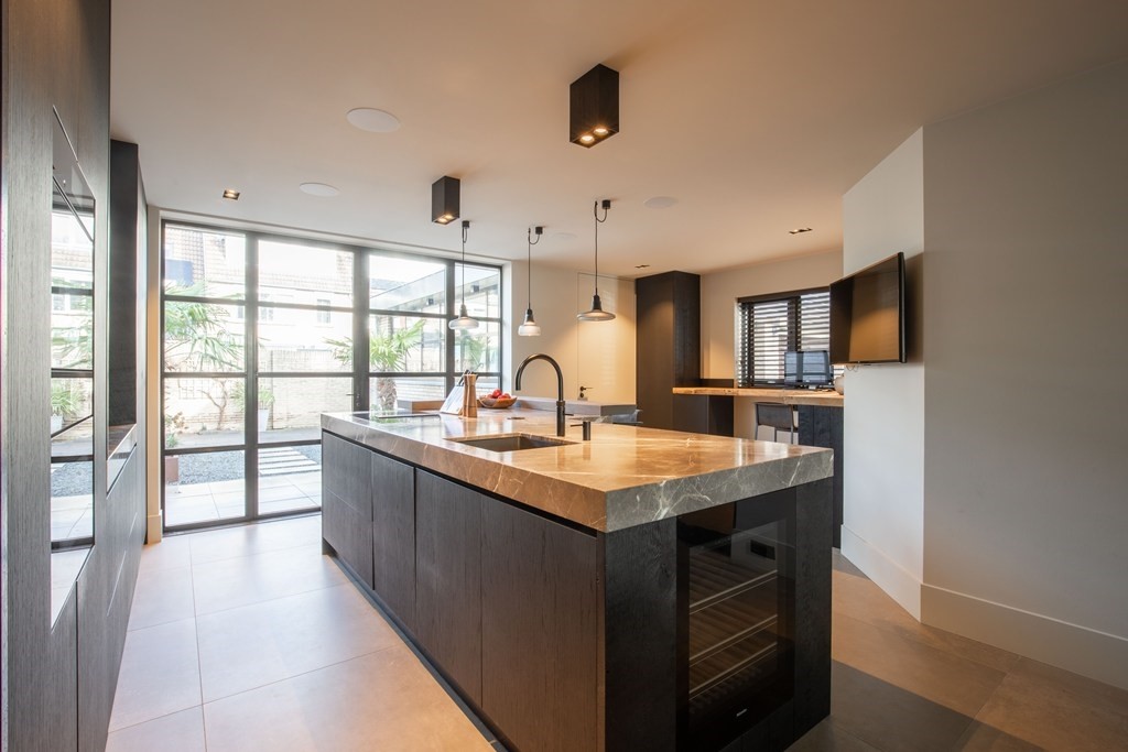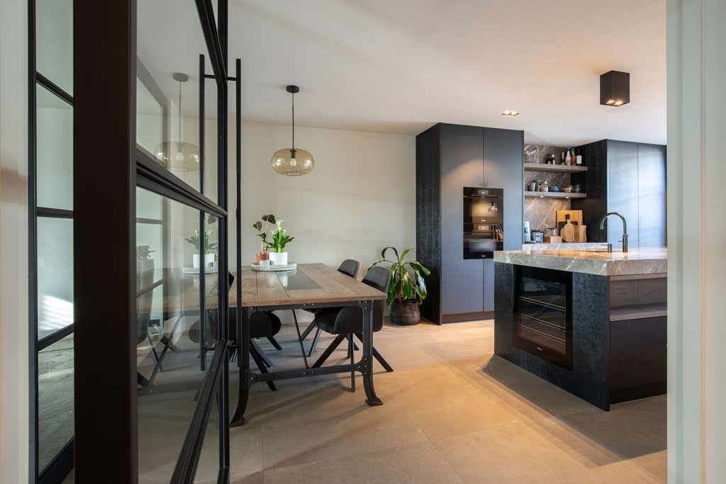 Vanuit de hal ontvouwt zich, achter een indrukwekkende taatsdeur, het kloppend hart van de woning: de woonkeuken. Een ruimte die niet ontworpen is om alleen te functioneren, maar om te leven. De woonkeuken en woonkamer zijn stijlvol van elkaar gescheiden door een taatswand met taatsdeur – een krachtig architectonisch statement waarin design en functionaliteit perfect samenkomen. Het royale kook- en spoeleiland vormt het middelpunt, met daaromheen barkrukken die uitnodigen tot lange avonden, gesprekken en samenzijn. Het hoogwaardige apparatuurpakket laat niets te wensen over: een inductiekookplaat met geïntegreerde afzuiging, klimaatkast, combi-stoomoven, combimagnetron, koelkast, vriezer en vaatwasser zijn volledig geïntegreerd en afgewerkt op topniveau, terwijl de Quooker-kraan het geheel compleet maakt. De ruimte is zó royaal opgezet dat naast het eiland moeiteloos een grote eethoek past én er extra werkruimte is gecreëerd. Openslaande deuren verbinden de woonkeuken direct met de achtertuin, waardoor binnen en buiten naadloos in elkaar overlopen.