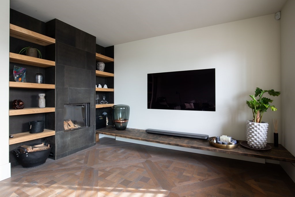 Aan de voorzijde van de woning bevindt zich de woonkamer, bereikbaar via een taatswand. Hier heerst rust, sfeer en gastvrijheid. Een genot om in thuis te komen en om gasten te ontvangen. De open haard vormt het warme middelpunt, de sfeervolle erker zorgt voor licht en karakter en de strakke afwerking maakt dat je hier automatisch vertraagt. Een plek waar comfort en stilte samenkomen.