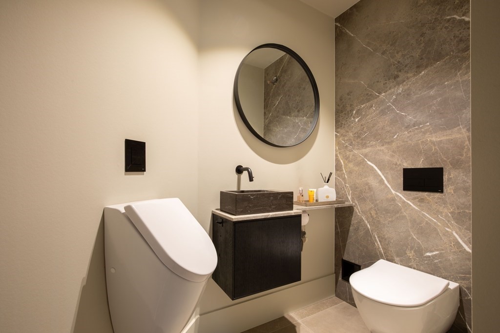 Nog voordat je echt binnen bent, weet je het al: dit huis voelt anders. Geen dertien-in-een-dozijn, maar een woning met karakter en overtuiging.De entree leidt naar een royale hal waar ruimte, rust en verfijning gelijk al samenkomen. Alles is strak, doordacht en perfect afgewerkt. De uitgebreide meterkast is naadloos geïntegreerd en de toiletruimte is zeer luxe uitgevoerd, voorzien van een vrijdragend toilet, een urinoir en een elegant fonteintje.