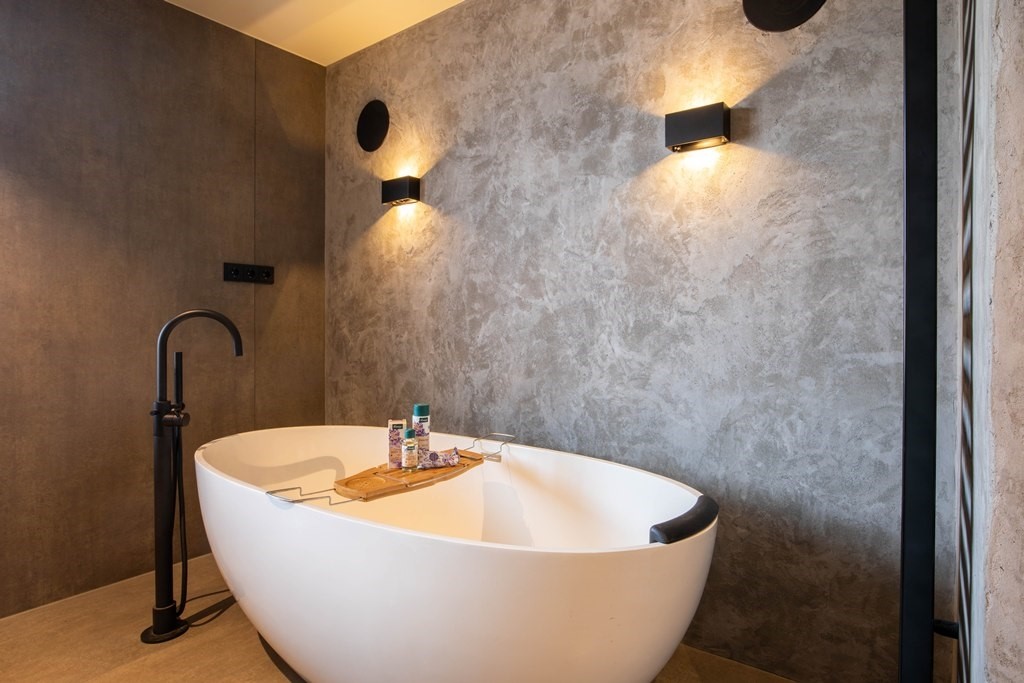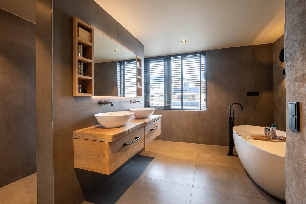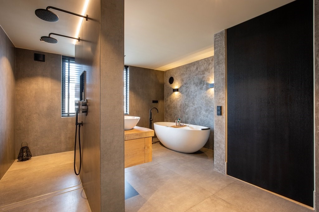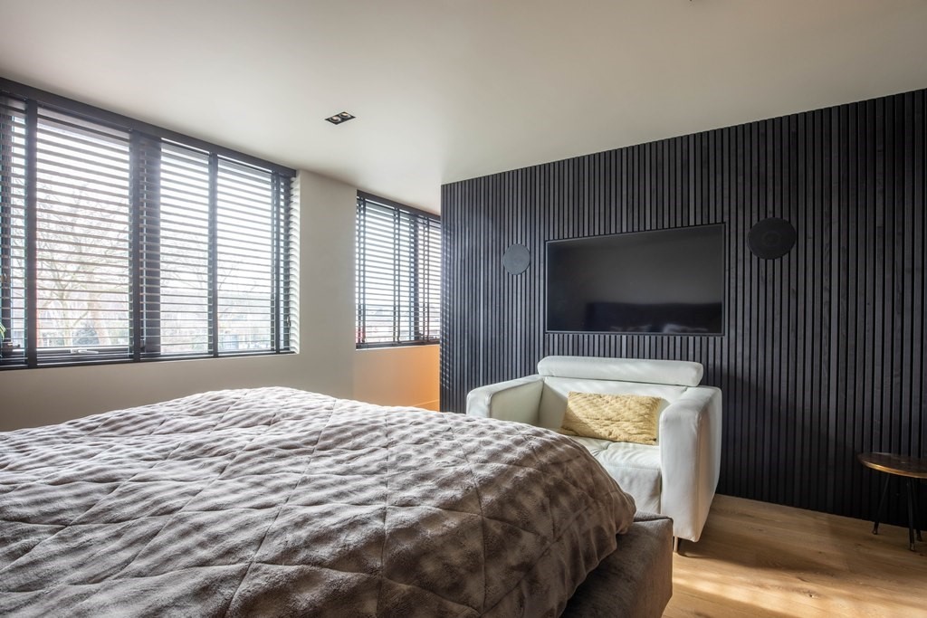 Aan de voorzijde ligt de slaapkamer, opgezet als een echte privésuite. Een slimme scheidingswand met ruimte voor televisie creëert geborgenheid en comfort. Aansluitend bevindt zich een prachtige walk-in closet, bereikbaar vanuit zowel de slaapkamer als de badkamer, slim afgescheiden en perfect geïntegreerd. De badkamer zelf voelt als een luxe spa: een vrijstaand ligbad, een royaal dubbel wastafelmeubel en een dubbele inloopdouche waar je zo binnenstapt. Hoogwaardige materialen, royale afmetingen en een perfecte indeling maken dit tot een ruimte die dagelijks voelt als een verwenmoment.